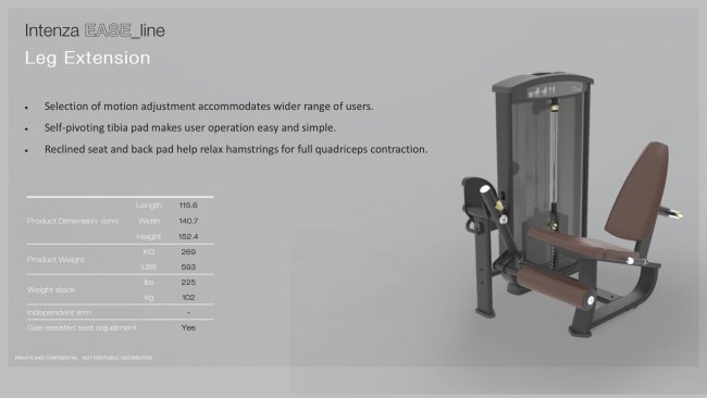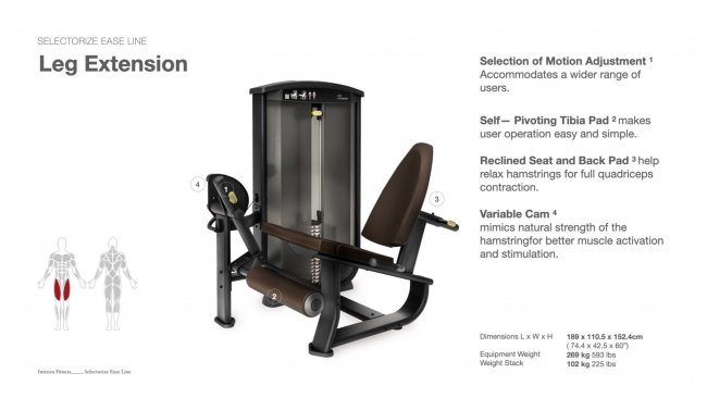 Leg Extension EL-09 ประเภท : Intenza Fitness SELECTORIZED EASE LINE กลุ่มผลิตภัณฑ์เครื่องออกกำลังกายแบบ selectorized ที่ถูกออกแบบมาอย่างละเอียดโดยคำนึงถึงชีวกลศาสตร์ ความสะดวกสบาย และความง่ายต่อการใช้งาน สามารถรองรับนักยกน้ำหนักทุกระดับความสามารถ โดย Ease line มีเป้าหมายในการออกกำลังกายกล้ามเนื้อทุกกลุ่มหลัก พร้อมด้วยการออกแบบที่กะทัดรัดและมีสไตล์ ชีวกลศาสตร์