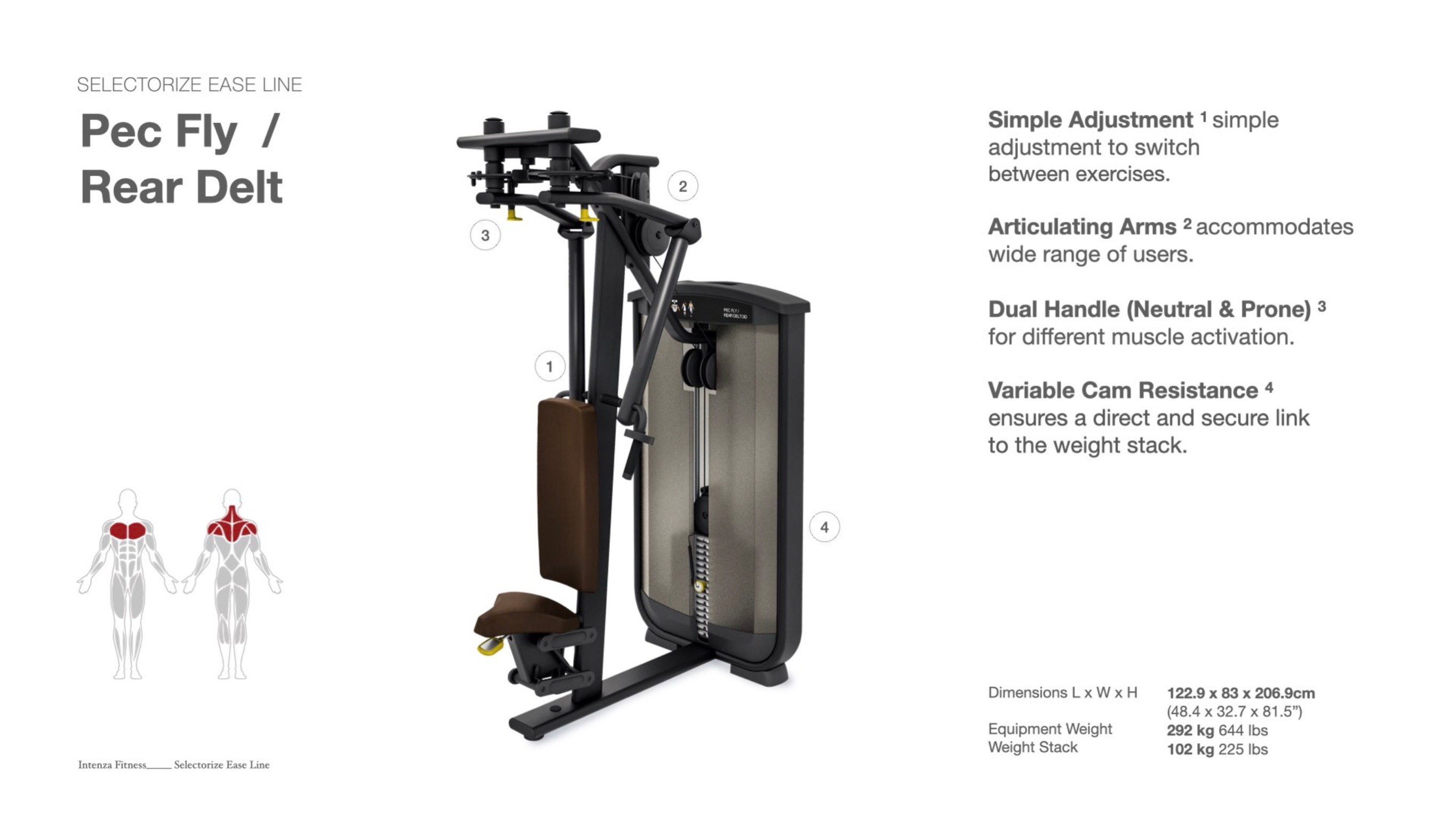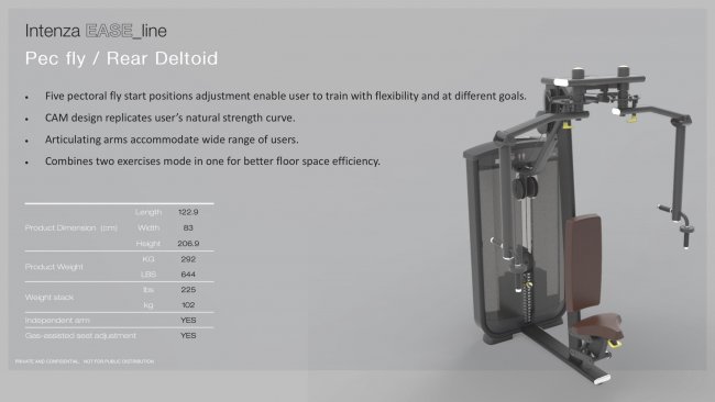 Intenza Pec Fly / Rear Deltoid EL-14 ประเภท : Intenza Fitness SELECTORIZED EASE LINE กลุ่มผลิตภัณฑ์เครื่องออกกำลังกายแบบ selectorized ที่ถูกออกแบบมาอย่างละเอียดโดยคำนึงถึงชีวกลศาสตร์ ความสะดวกสบาย และความง่ายต่อการใช้งาน สามารถรองรับนักยกน้ำหนักทุกระดับความสามารถ โดย Ease line มีเป้าหมายในการออกกำลังกายกล้ามเนื้อทุกกลุ่มหลัก พร้อมด้วยการออกแบบที่กะทัดรัดและมีสไตล์ ชีวกลศาสตร์