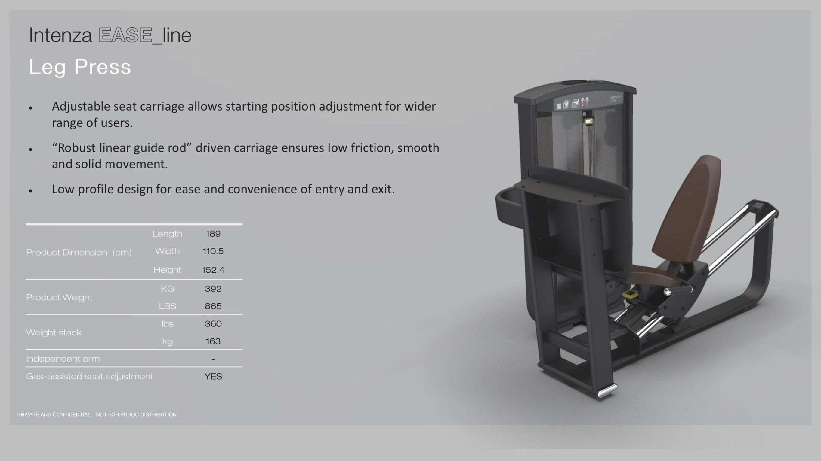 Intenza Leg Press EL-07 ประเภท : Intenza Fitness เครื่อง Leg Press จาก Intenza Fitness Ease Line ได้รับแรงบันดาลใจจากการเคลื่อนไหวตามธรรมชาติของร่างกายมนุษย์ อุปกรณ์ออกกำลังกายของ Intenza Fitness มีการใช้ชีวกลศาสตร์ที่พิสูจน์แล้ว รายละเอียดทางการยศาสตร์ การออกแบบที่ทันสมัย และการใช้งานที่เข้าใจง่าย ด้วยคุณสมบัติเหล่านี้ อุปกรณ์ดังกล่าวจึงยกระดับมาตรฐานของอุปกรณ์ออกกำลังกายสมัยใหม่ แต่ละเครื่องติดตามรูปแบบการเคลื่อนไหวตามธรรมชาติของร่างกาย ทำให้การเชื่อมต่อระหว่างร่างกายและจิตใจเข้มแข็งขึ้น อุปกรณ์ออกกำลังกายของ Intenza Fitness มีการออกแบบที่สวยงาม จึงเป็นจุดเด่นที่แท้จริง การออกแบบที่เรียบง่ายและใช้จานสีเข้มแต่เป็นกลางซึ่งดูดซับแสง ทำให้ทุกพื้นที่ที่มีการติดตั้งอุปกรณ์ดูโปร่งและน่าใช้ ความเชี่ยวชาญล้ำสมัยที่นำมาใช้ในระหว่างการออกแบบอุปกรณ์ของ Intenza Fitness ช่วยให้อุปกรณ์แต่ละเครื่องทนทานต่อการฝึกที่เข้มข้นที่สุด ซึ่งทำให้ Intenza Fitness Ease Line เป็นสายอุปกรณ์ออกกำลังกายที่แข็งแกร่ง น่าดึงดูด และมีความหลากหลายมาก ขนาดของ Intenza Fitness Ease Line Leg Press: