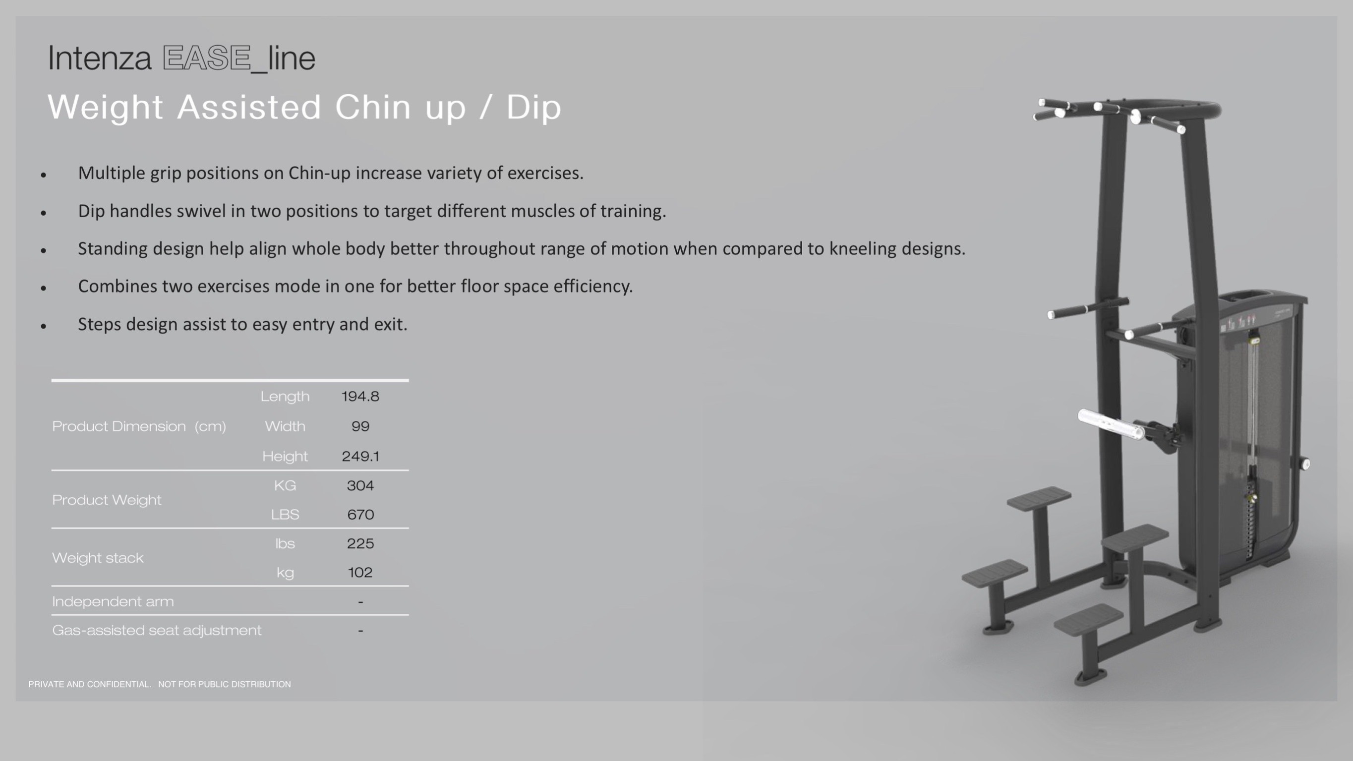 INTENZA WEIGHT ASSISTED CHIN UP/DIP EL-12 ประเภท : Intenza Fitness SELECTORIZED EASE LINE กลุ่มผลิตภัณฑ์เครื่องออกกำลังกายแบบ selectorized ที่ถูกออกแบบมาอย่างละเอียดโดยคำนึงถึงชีวกลศาสตร์ ความสะดวกสบาย และความง่ายต่อการใช้งาน สามารถรองรับนักยกน้ำหนักทุกระดับความสามารถ โดย Ease line มีเป้าหมายในการออกกำลังกายกล้ามเนื้อทุกกลุ่มหลัก พร้อมด้วยการออกแบบที่กะทัดรัดและมีสไตล์ ชีวกลศาสตร์